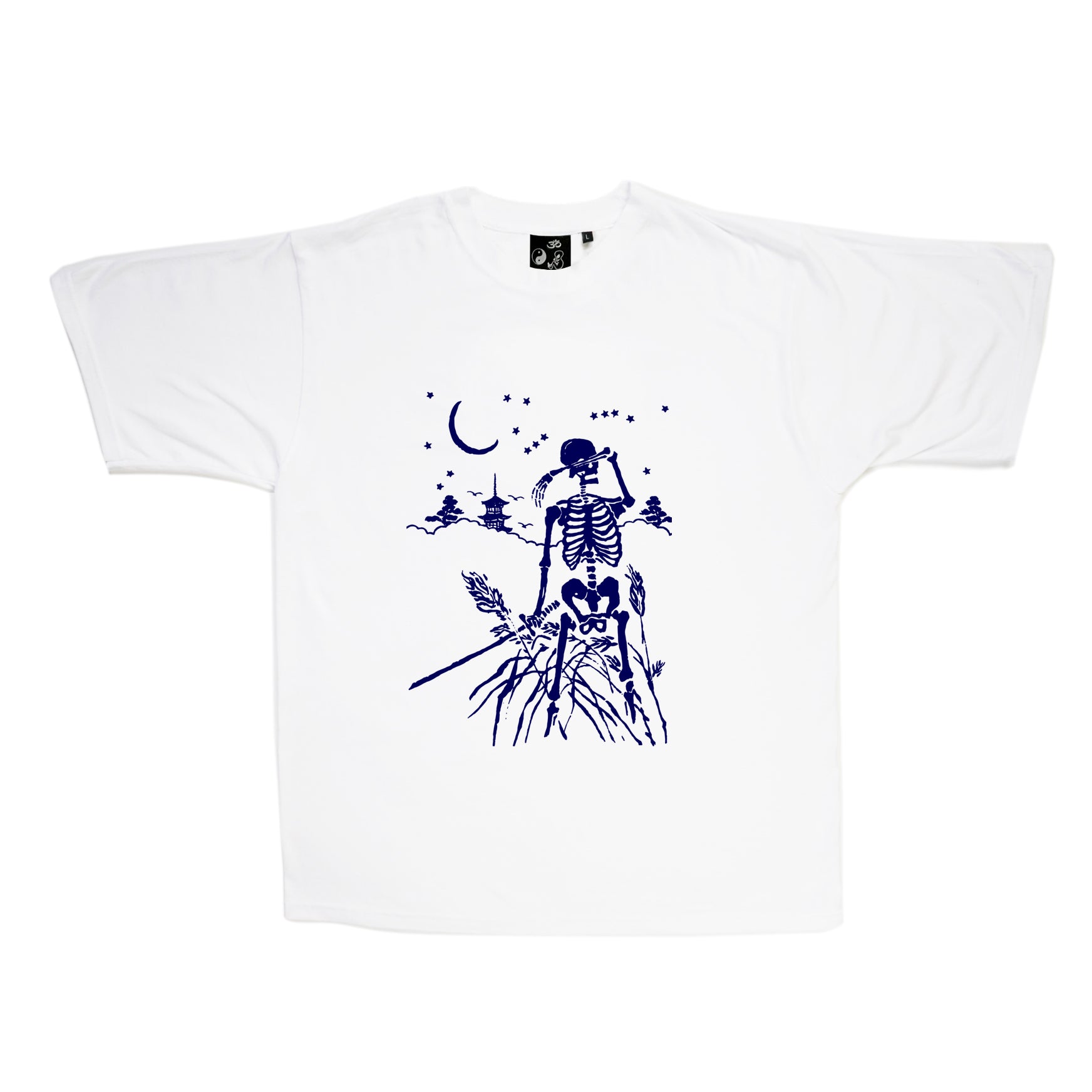 Exclusive 'Midnight Warrior' T-Shirt in White, part of our A/W22 collection. An extremely intricate, screen printed graphic on the chest features a depiction of a skeleton weilding a katana under the midnight sky.