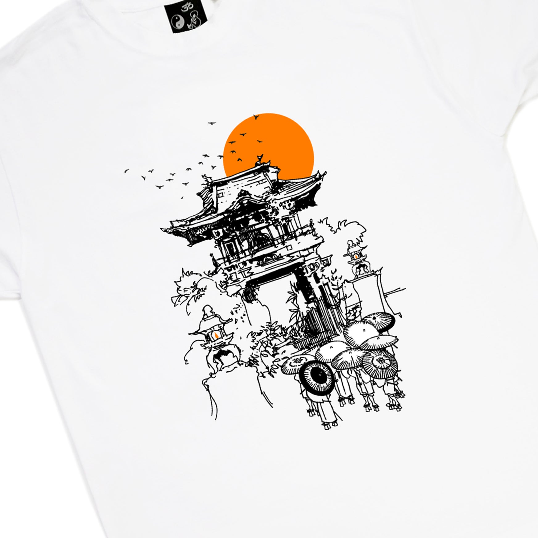 Exclusive 'Sunset Temple' T-Shirt in White, part of our A/W22 collection. An extremely intricate, two colour screen printed graphic on the chest features a Japanese temple at sunset.