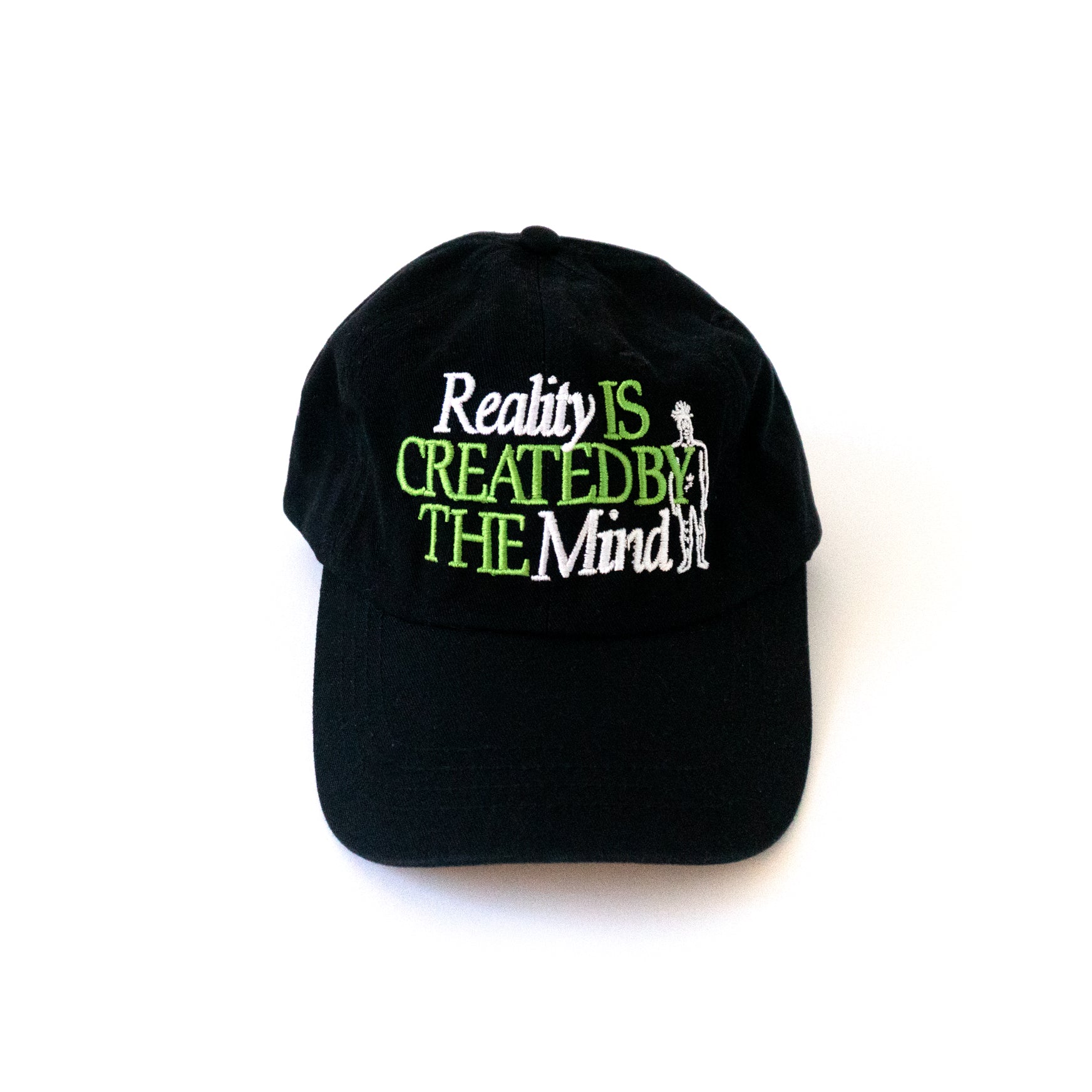 Exclusive 'Reality' cap in Black. The intricate embroidered graphic on the front features a graphic inspired by lucid dreams, with another embroidered graphic on the side depicting two celestial bodies. Only a very limited amount will be made with no re-stocks.