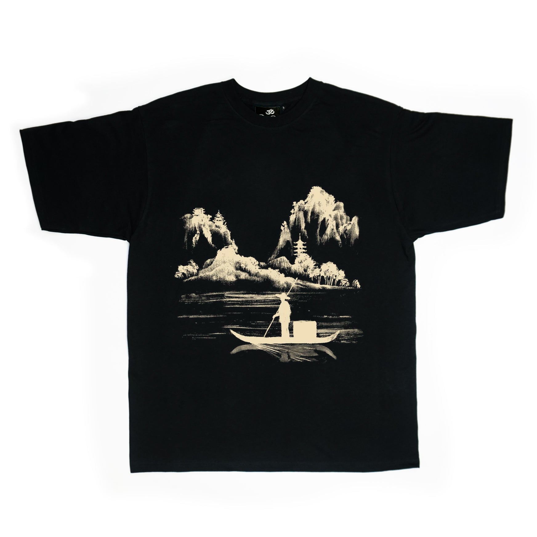 Exclusive 'Morning Fishing in Japan' T-Shirt in Black, part of our S/S22 collection. An extremely intricate screen printed graphic on the chest features a man fishing, overlooking a lake and tree lined mountains in Japan. Only a very limited amount will be made with no re-stocks.